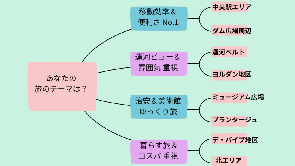 - 旅の目的やスタイル(観光重視、雰囲気重視など)に最適化された、失敗しない宿泊エリアの選び方