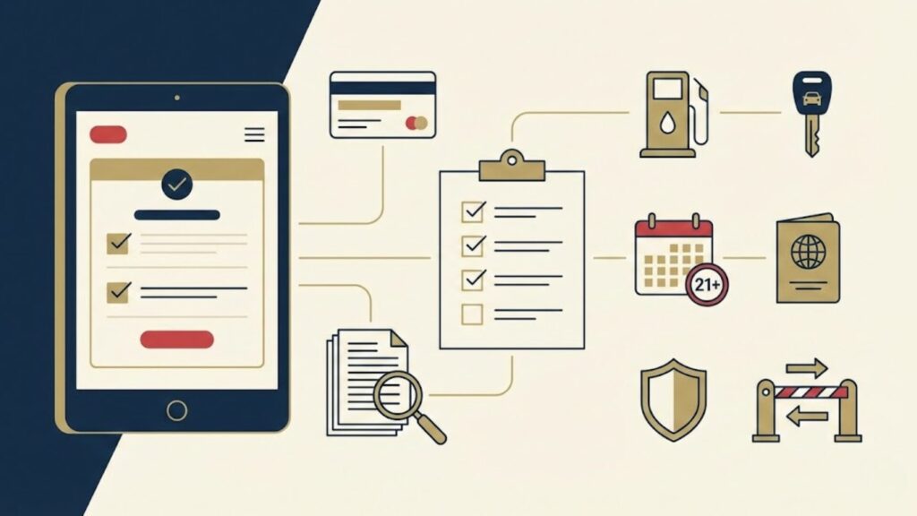 - デポジット額、年齢条件、越境ポリシー、燃料ポリシーなどを確認