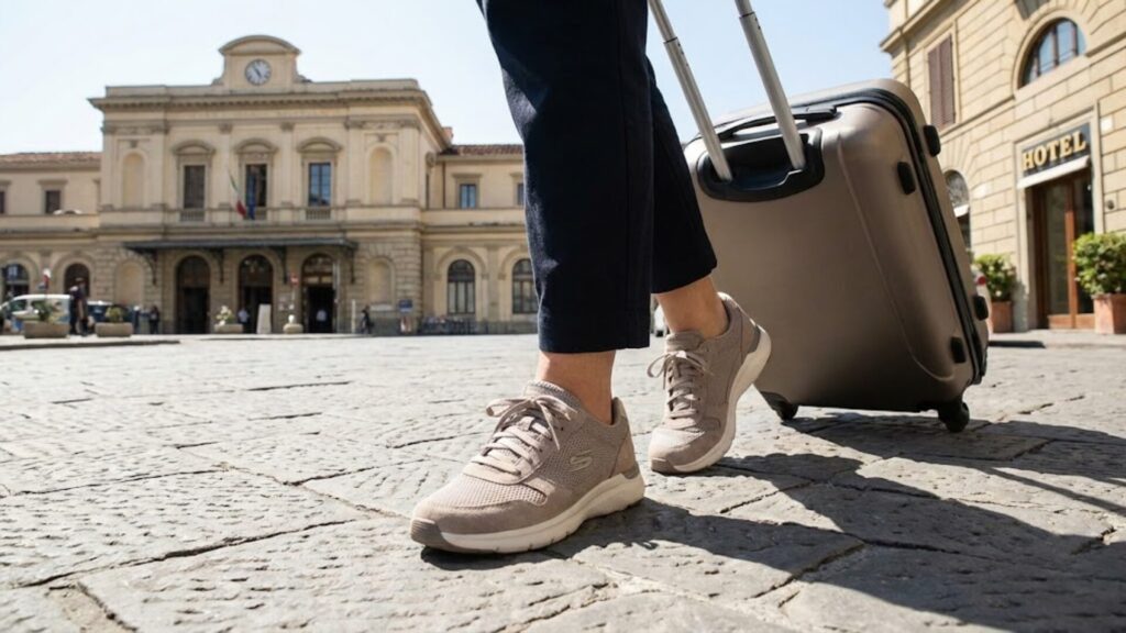 石畳の街を軽やかに楽しむためには、「履き慣れたスニーカー」、あるいはクッション性の高いウォーキングシューズが最高のパートナーです。