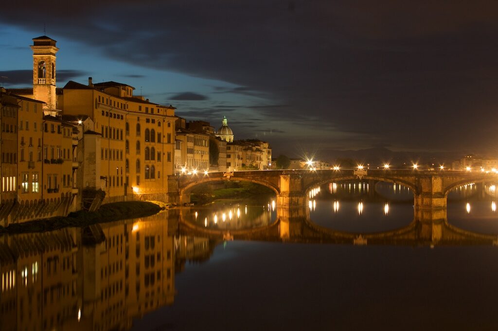 アルノ川が夕日で黄金色に染まり、街灯が石畳をオレンジ色に照らし始めると、街は一気にロマンチックな表情を見せます。