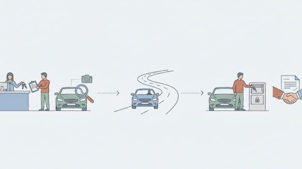 - 受取時の車両チェックから返却時の精算確認までの具体的な手順