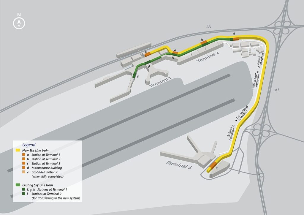 ターミナル間の移動は「SkyLine」(自動運転ピープルムーバー)または無料の連絡バスを利用します。