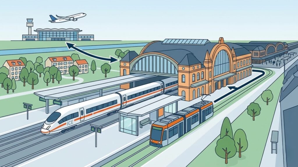 ICE長距離列車も中央駅から直接利用でき、ケルン・ミュンヘン・パリなど主要都市への移動にも便利です。