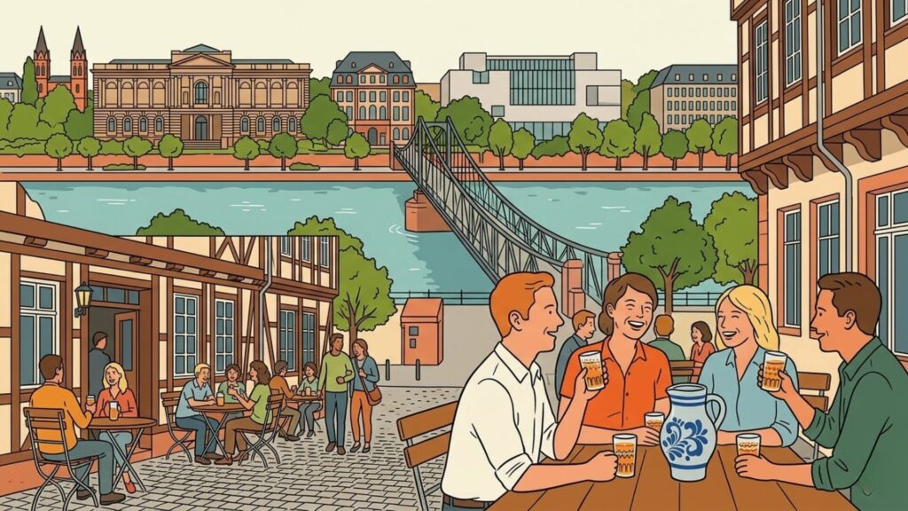 ザクセンハウゼン(Sachsenhausen)はマイン川の南岸に広がる歴史ある地区で、フランクフルトのなかでも独自の文化と食文化を色濃く残しているエリアです。