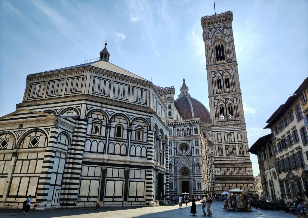 大聖堂のクーポラと洗礼堂、ジョットの鐘楼が並ぶドゥオモ広場。