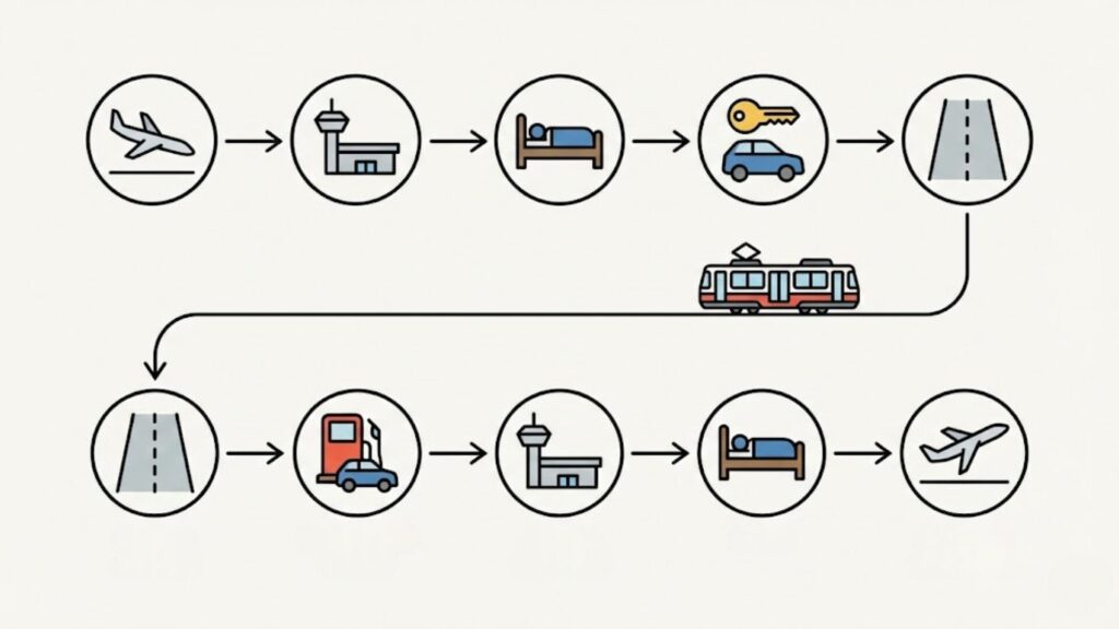 空港近くに1泊入れることで、到着日は休息に充て、翌朝に万全の状態でドライブを開始する(または前日のうちにゆっくり返却を済ませておく)という余裕のあるスケジュールを組みやすくなります。