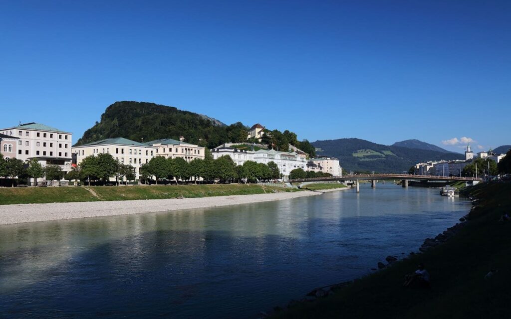 ホテルのすぐ横はザルツァハ川の遊歩道。朝早起きして、川沿いを歩きながら対岸の城塞をバックに写真を撮るのがおすすめ。人が少ない時間帯なら、絶景を独り占めできます。